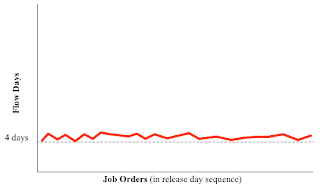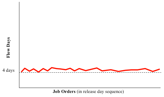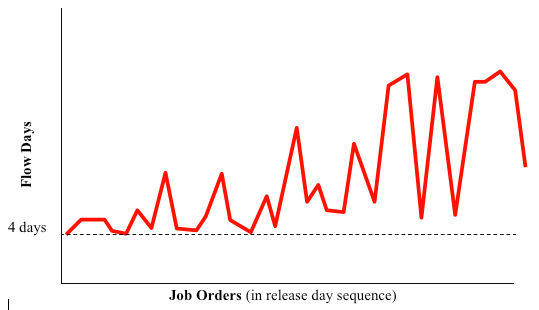 The graph demonstrates that as more job orders are released into the shop floor, the more the workflow is congested contributing to the wild fluctuations of flow times. In the middle of the simulation, participants would have little confidence in answering the question “When will this latest job order be completed?”