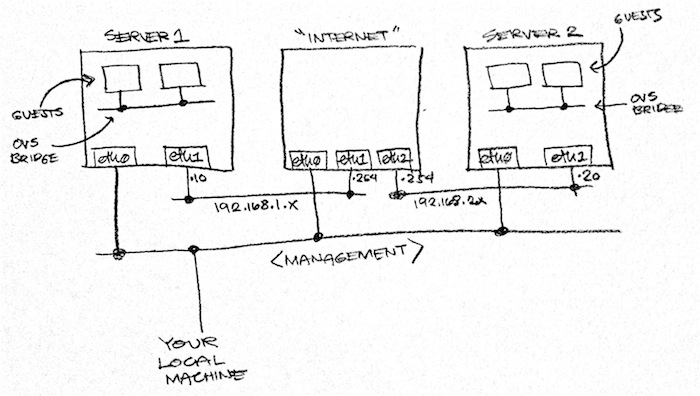 OVS is installed via some .deb files that I built from source and shared via Dropbox so as to save time. If you don’t trust me enough, you can build it from source yourself by replacing nodes.pp with the nodes.pp.build_from_source file that I included in the same directory. Note that if you choose that route, make sure to increase the RAM for each VM to 512MB or OVS won’t compile.