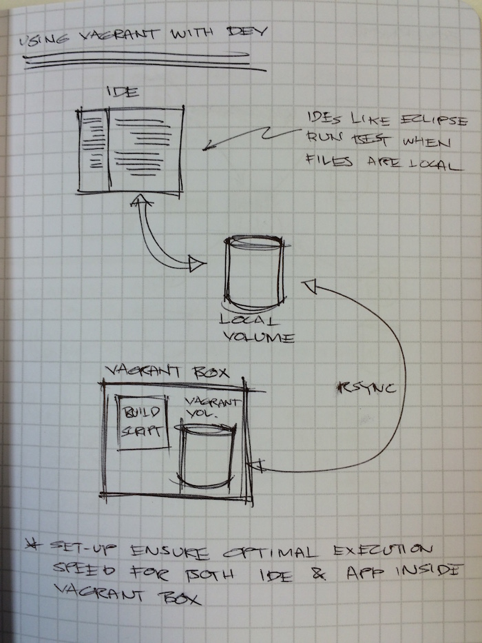Your initial thought then might be to mount the local directory where your source files are into the Vagrant box or you might also do it the other way where you do an NFS share from the vagrant box to your local disk. From what I understand, neither options are optimal since it can slow down one or the other. Thus the speaker suggested that your IDE and the build script in the Vagrant box have their own local copy of the source and just rsync between the two.
