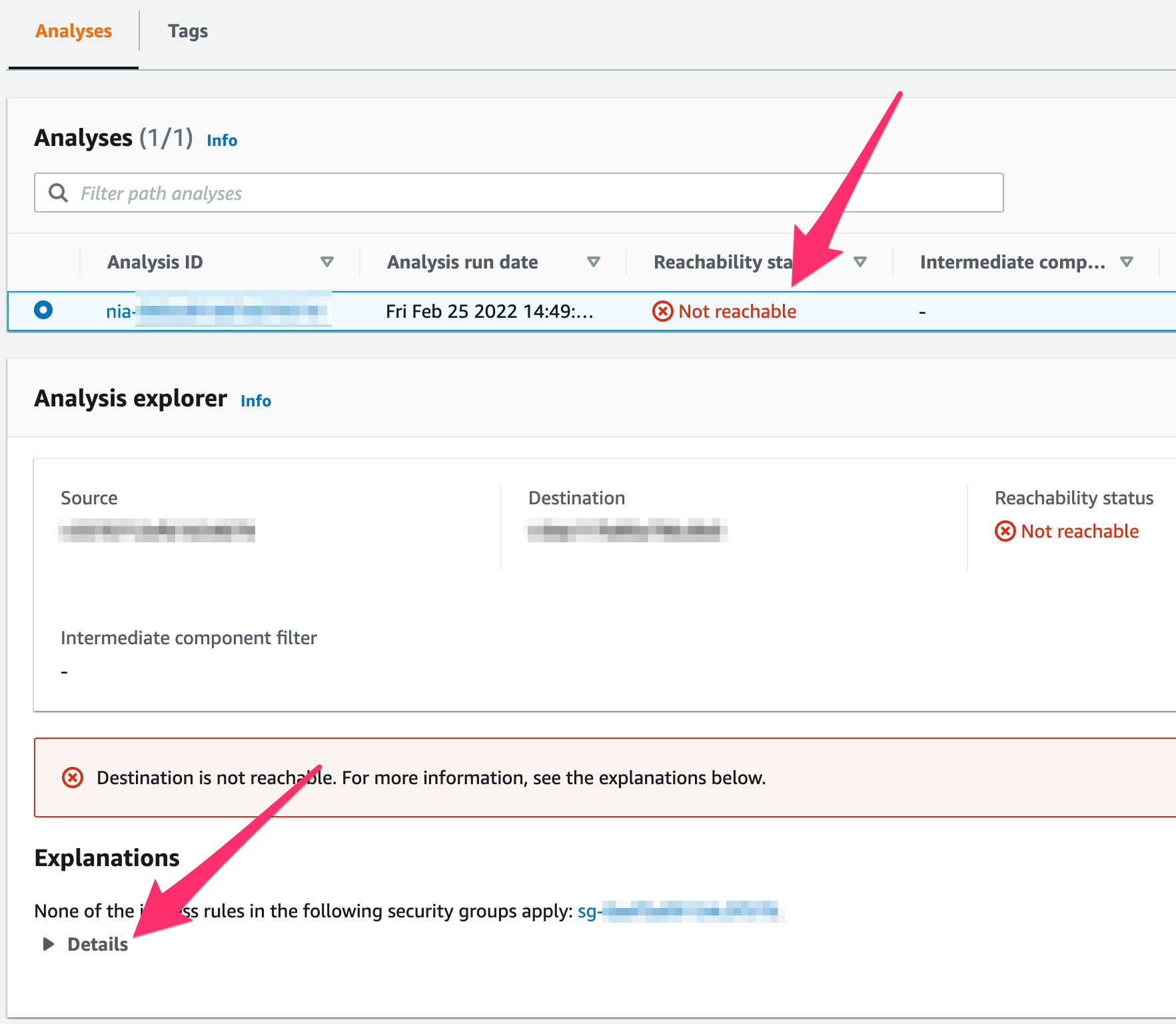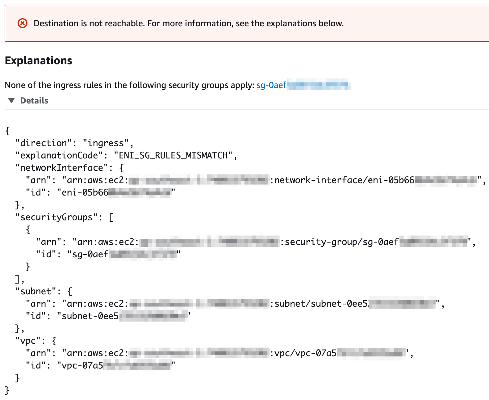 When you expand that Details section, you’ll get a more detailed explanation of why the instance can’t reach the other.