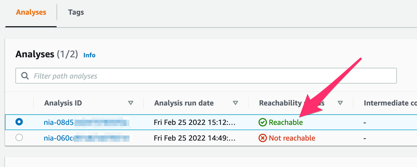 After you update the stack and analyze the path again, you should see another analysis in the Analysis section, this time showing that the connection is reachable: